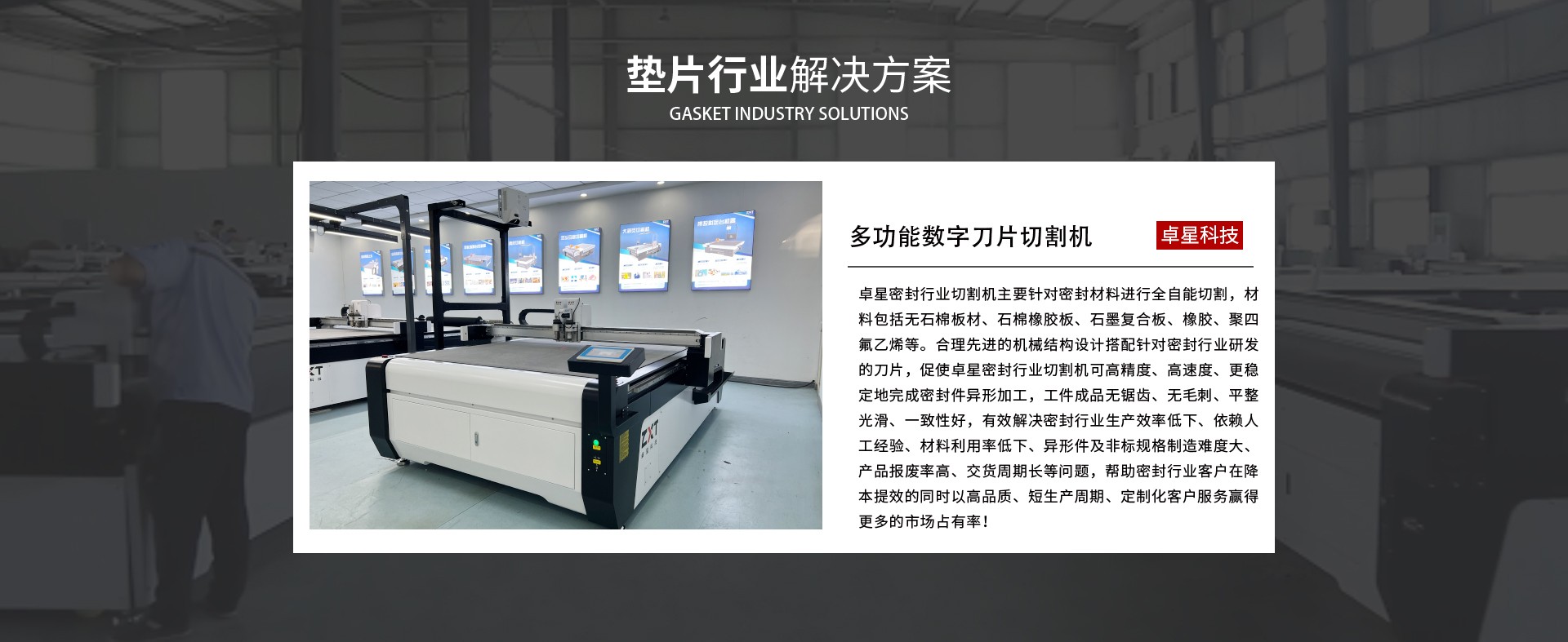 卓星密封行業切割機主要針對密封材料進行全自能切割,材料包括無石棉板材、石棉橡膠板、石墨復合板、橡膠、聚四氟乙烯等。合理先進的機械結構設計搭配針對密封行業研發的刀片,促使卓星密封行業切割機可高精度、高速度、更穩定地完成密封件異形加工,工件成品無鋸齒、無毛刺、平整光滑、一致性好,有效解決密封行業生產效率低下、依賴人工經驗、材料利用率低下、異形件及非標規格制造難度大、產品報廢率高、交貨周期長等問題,幫助密封行業客戶在降本提效的同時以高品質、短生產周期、定制化客戶服務贏得更多的市場占有率!